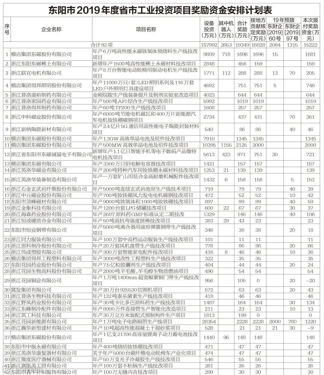 根据《东阳市振兴实体经济(传统产业改造)财政专项激励资金管理办法》(东政办发[2017]268号)等相关文件要求,经中介机构审定和市技改及两化融合领导小组成员单位审议,拟对2019年度92个工业投资和62个两化融合项目实施财政奖励,现将奖励方案予以公示,若有异议,请于公示之日起七日内向市经信局投资创新科、数字经济科,市财政局企业科反映。
