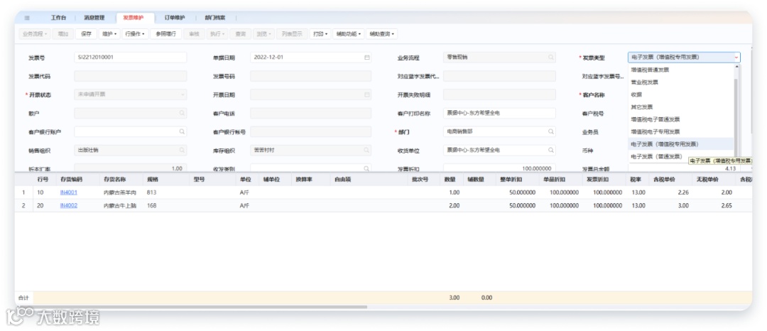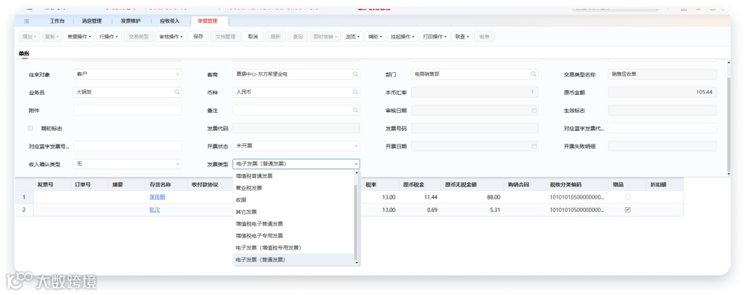 对应全电发票的两个发票类型为:电子发票(增值税专用发票)、电子发票(普通发票);支持了销售发票向发起开票申请,也支持应收单发起开票申请。