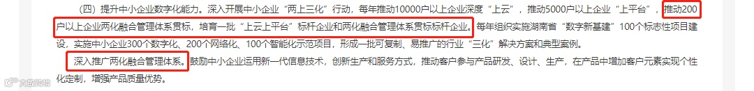 (四)提升中小企业数字化能力。深入开展中小企业“两上三化”行动,每年推动10000户以上企业深度“上云”,推动5000户以上企业“上平台”,推动200户以上企业两化融合管理体系贯标,培育一批“上云上平台”标杆企业和两化融合管理体系贯标标杆企业。每年组织实施湖南省“数字新基建”100个标志性项目建设,实施中小企业300个数字化、200个网络化、100个智能化示范项目,形成一批可复制、易推广的行业“三化”解决方案和典型案例。