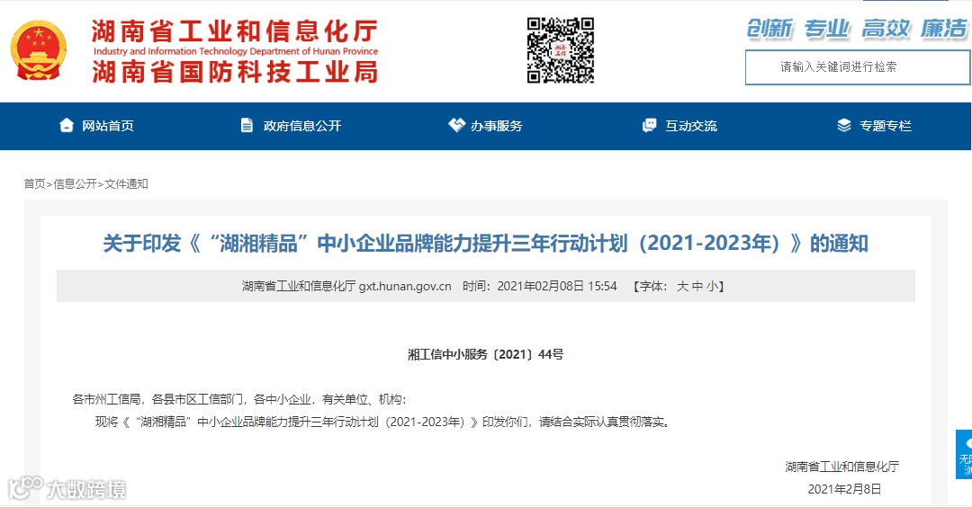 2月8日,湖南省工业和信息化厅官网发布“关于印发《“湖湘精品”中小企业品牌能力提升三年行动计划(2021-2023年)》的通知”。