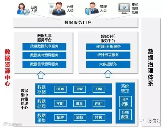 数据资源中心包含一中心+两平台+一体系,即:数据集中存储处理中心、数据共享服务平台、数据分析服务平台,加上用户可访问的数据服务门户,加上一套数据治理体系。