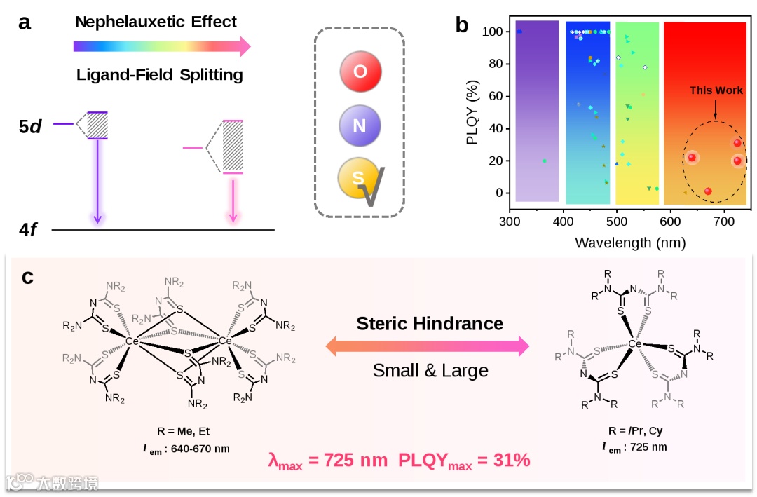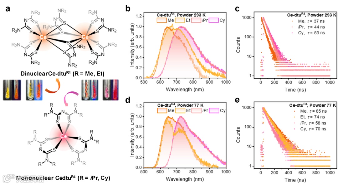 借鉴无机固体材料中利用质心位移与晶体场分裂理论对铈(III)5d能级的调节思路,在配体骨架上引入共价性较强的硫配位点与给电子基团有望降低铈(III)的5d激发态能级,实现长波发射。近日,北京大学化学与分子工程学院的刘志伟-卞祖强课题组在Nature Communications杂志上发表了题为“Lanthanide cerium(III) complex with deep-red emission beyond 700nm”的论文,该工作通过引入双齿二硫代缩二脲配体,同时借助对外层空间位阻的调控,合成得到了两类分别具有橙红光与深红光发射的铈(III)配合物。该工作突破了目前铈(III)基材料已有的发射波长记录,也为氮、氧配位以外的稀土配合物提供了全新的设计思路。
