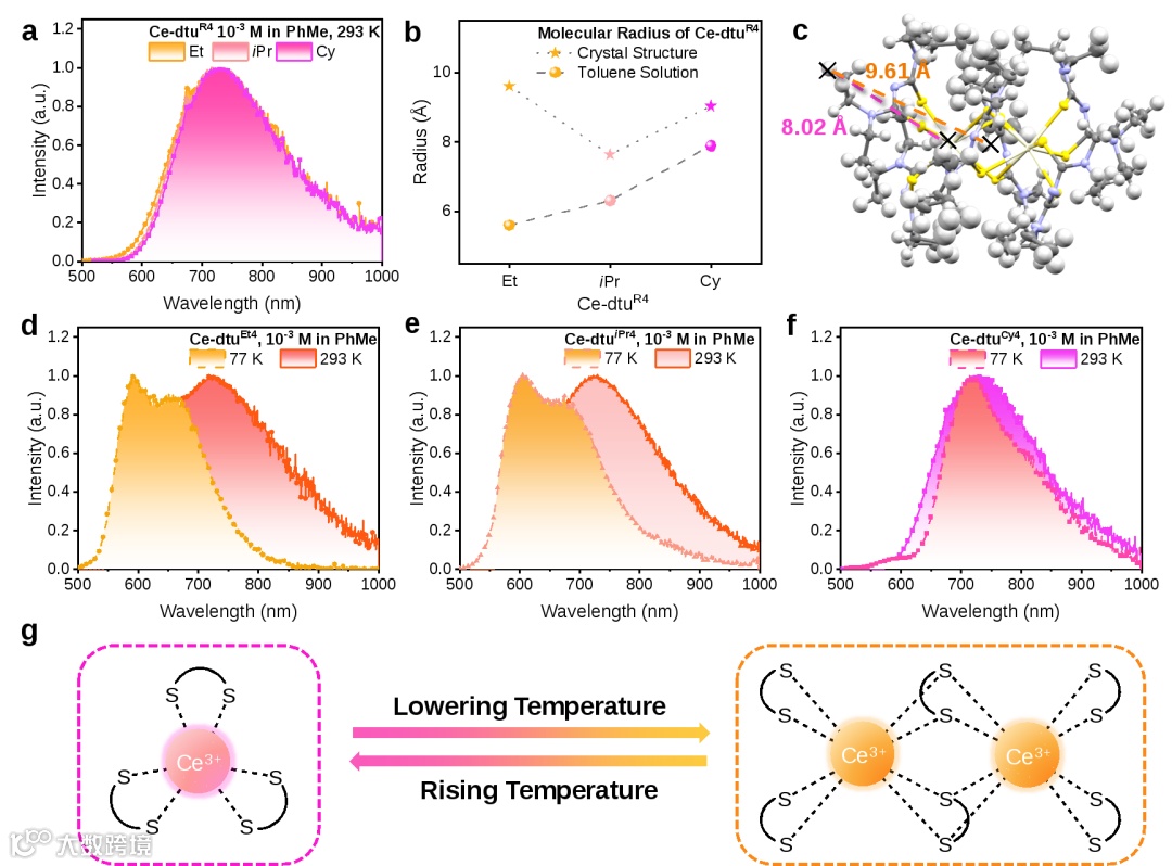 综上,该工作基于二硫代缩二脲配体,合成得到了全新的长波发射铈(III)配合物Ce-dtuR4。通过引入不同大小的位阻基团,铈(III)配合物具有不同的配位结构,并分别表现出橙红光与深红光发射,突破了铈(III)的发射波长记录。此外,变温光谱的测试结果揭示了配合物的“单核”与“双核”结构转换在溶液中的温度依赖性,展现了这类配合物在配位化学中的独特性质。上述工作不仅合成了一系列结构新颖的S配位稀土Ce(III)配合物,同时也展示了Ce(III)在全色域发光中的巨大潜力。