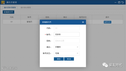 点击“新增操作员”按钮。账号位置输入开票员姓名,身份默认开票员,账号状态可用,点击“保存”,新增成功。如图1-3-2所示。