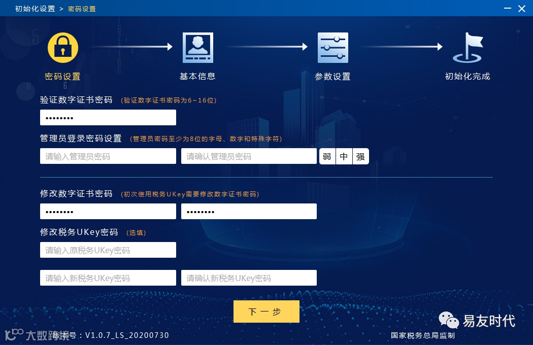 验证数字证书密码,管理员登录密码默认为空,可以在此处选择修改税务Ukey密码和管理员登录密码,也可以选择都不修改。首次使用税务Ukey需要修改数字证书密码,这里填写两次修改后的证书密码,点击“下一步”。如图1-2-2所示。