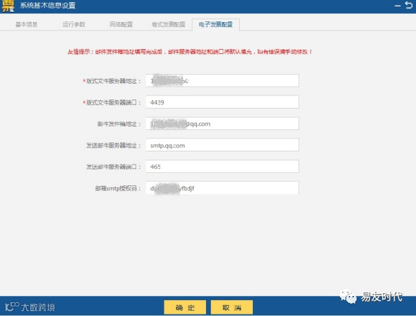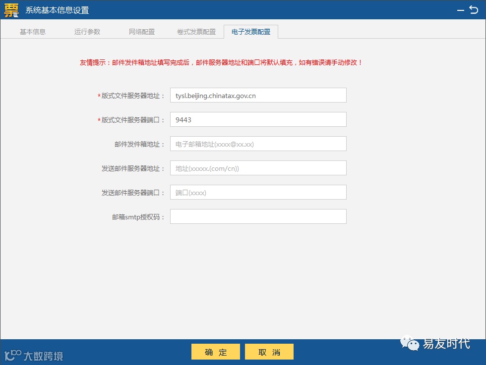 6、电子发票配置:首次开具增值税电子专用发票之前,需要正确设置电子发票配置,包括版式文件服务器地址、版式文件服务器端口、邮件发件箱和邮箱SMTP授权码。软件自动带出版式文件服务器地址,版式文件服务器端口,纳税人核实确认即可。如图1-6-1所示。