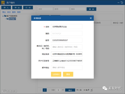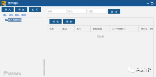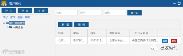 点击“确认”完成客户信息新增。这样开票时可直接选取使用该客户信息。同时客户编码模块也提供导入,导出和打印功能。如图1-4-5所示。