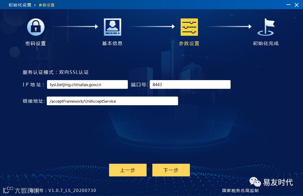 进行参数设置,确认发票上传服务器地址和端口号正确,点击“下一步”,完成参数设置,等待初始化完成。如图1-2-4所示。