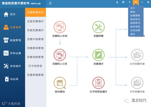 1)关于:显示纳税人基本信息、版权信息、开票系统版本信息等。