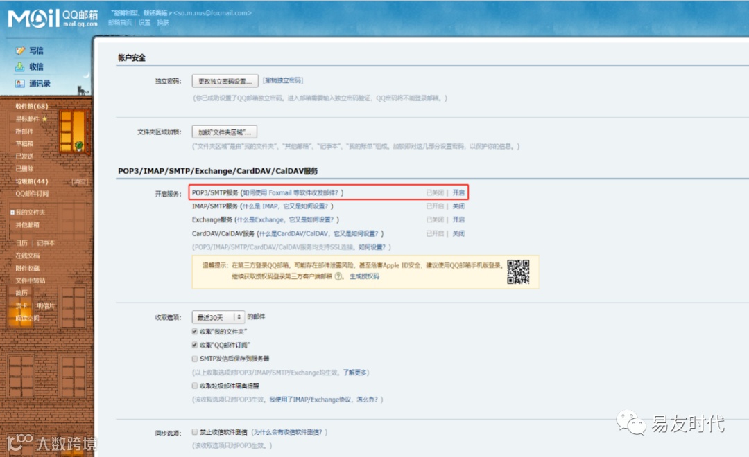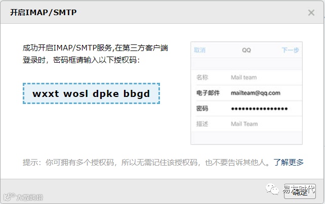 (关于邮箱SMTP授权码获取方式,这里以QQ邮箱为例进行说明:纳税人登录QQ邮箱,点击“首页/设置/账户”,找到POP3/IMAP/SMTP/Exchange/CardDAV/CalDAV服务,显示第三方客户端使用,生成授权码,也可点击POP3/SMTP服务右方的开启按钮,如图1-6-3所示。根据弹窗提示,发送短信到对应的号码进行验证,验证后页面上即显示邮箱SMTP授权码,把它复制粘贴到软件对应填写框,点击确定即可。如图1-6-4所示。)