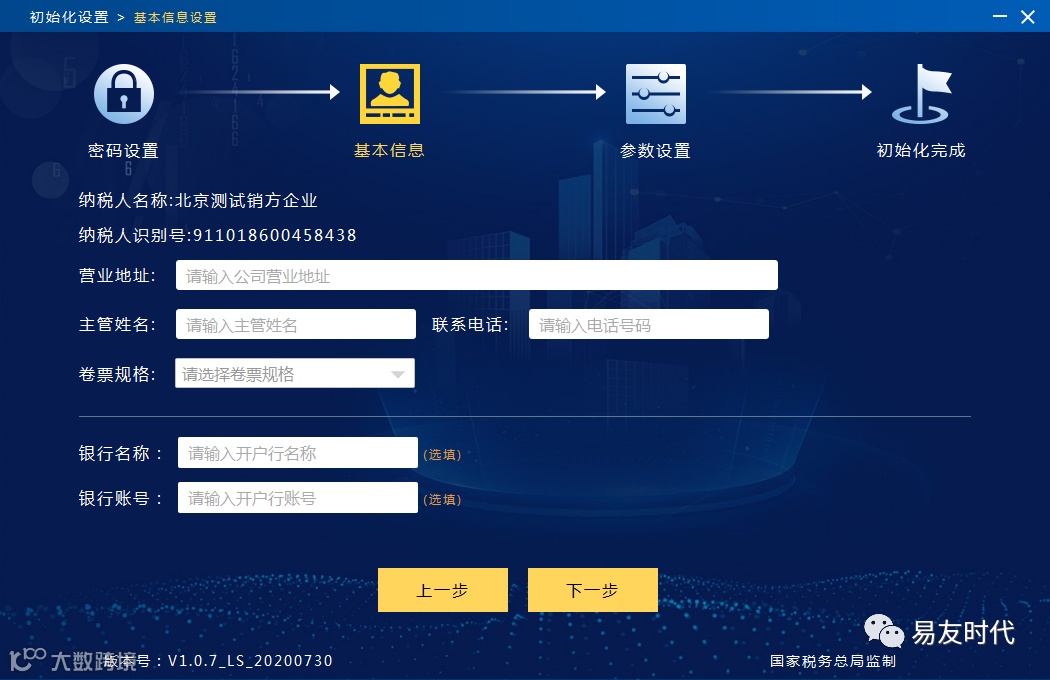 设置企业基本信息,依次填入营业地址、主管姓名、联系电话、银行名称、银行账号,点击“下一步”。如图1-2-3所示。