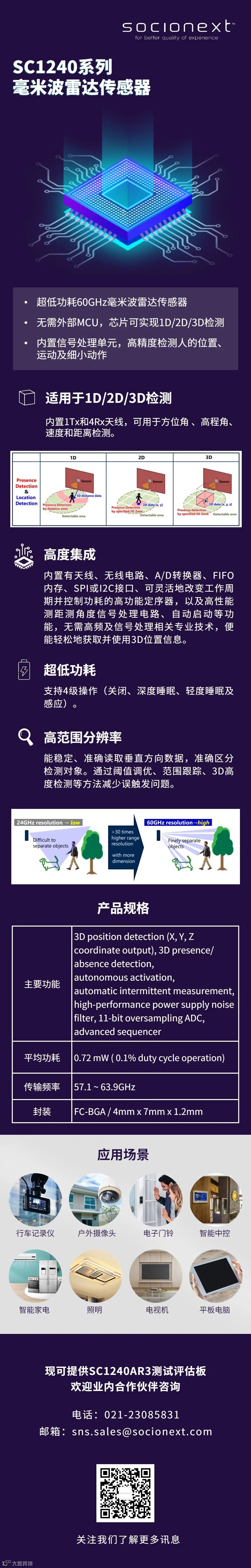 近日,SoC设计与应用技术领导厂商Socionext推出「SC1240系列」60GHz高精度毫米波雷达传感器,可用于人体位置和活动检测。新产品预计在2022年第二季度向客户交付样品,并于2023年第一季度开始量产。