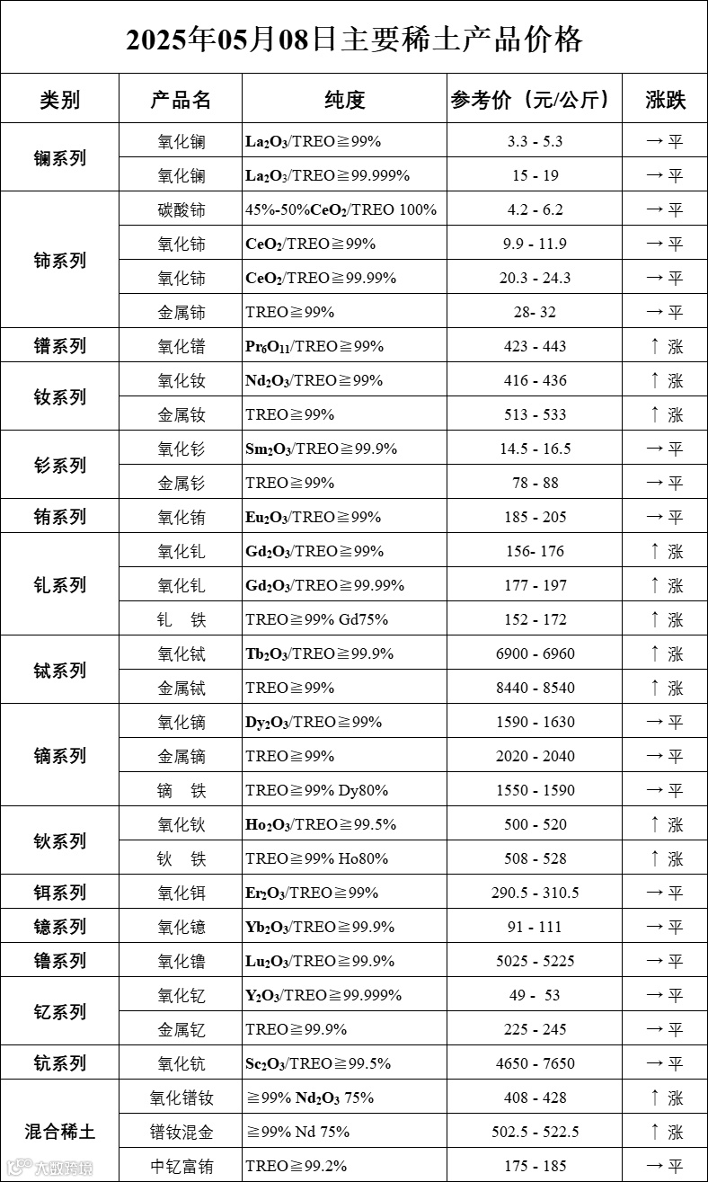 国内稀土价格局部稳定,个别小幅上涨。这主要是归因于五一假期结束后,部分下游用户询盘采购积极性有所提高,以及海外稀土价格上升,在一定程度上增强了国内稀土市场的信心。