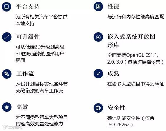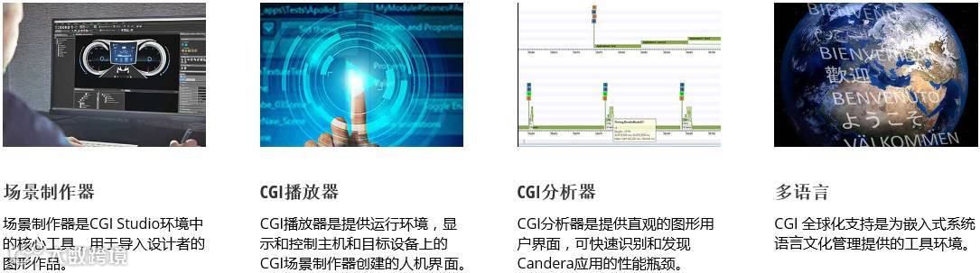 CGI Studio是一款不受硬件条件限制的可升级软件平台。开放式体系结构可使公司工作流实现高度一体化和自动化。一种工具方法就能实现以上所有特性,同时满足启动速度快、占用空间小、符合ASIL、 MISRA和SPICE等汽车行业重要标准和规定的要求。该软件可为汽车等领域顾客创建各种精美的个性化人机界面。