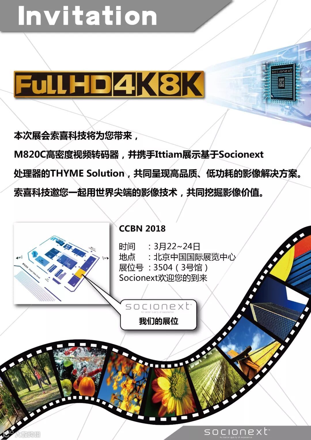 Socionex旨在为您提供世界级影像质量和技术的影像传送和专业视听解决方案。以边缘计算和联系为重心,建构解决方案,试图进一步开拓新市场以及扩大现有市场。我们提供的高性能低耗电SoC产品和解决方案,在服务器、FA、广播设备等工业设备范畴中是不可或缺的,通过将信息化为知识并且将联系的价值尽情发挥,提升顾客的服务和产品的价值。CCBN 2018,索喜科技与您相约!