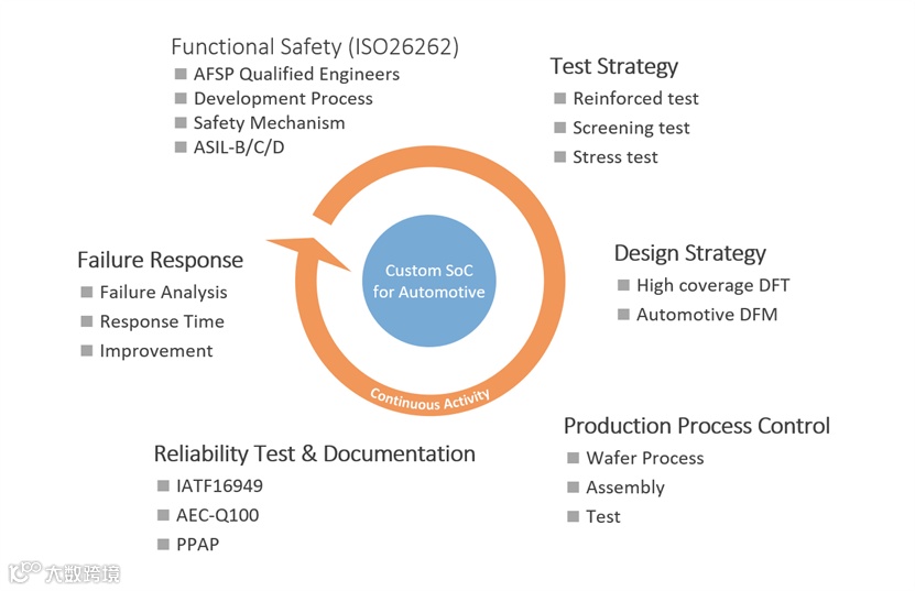 Socionext还与制造分包商密切合作开展质量管理等各种措施,致力于提供高质量、高可靠性的产品。通过设计策略(DFM/DFT)、测试策略、可靠性试验(AEC-Q100)、生产过程控制(汽车服务包)、功能安全体系(ISO26262)、文件(PPAP)、客户投诉(8D报告)等环节确防止不良芯片、减少制造缺陷的设计。