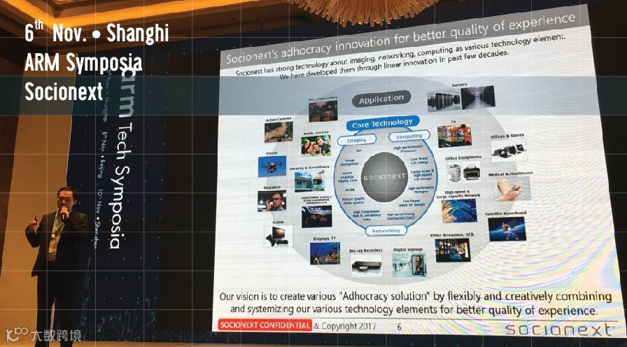在下午Next Generation Processing分会场,Socionext市场部高级经理 Alex Chen带来了主题为Variety of ARM Solutions by Socionext 的演讲报告。作为一家为全球客户设计、开发及提供片上系统芯片(System-on-Chip)产品的创新型企业,我们专注于影像成像、网络、计算机及其他尖端技术的发展及其应用的推动,集结世界第一流的专业知识、经验与丰富的IP产品组合,致力于提供更具效益的解决方案并提升用户体验。