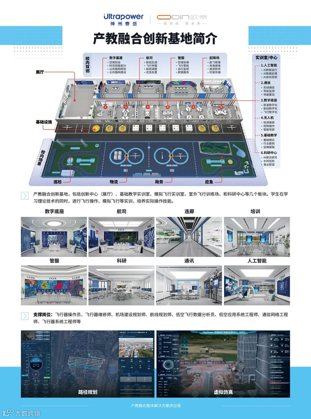 欧帝依托母公司神州泰岳在人工智能、大数据、物联网及新一代通信技术领域二十余年的深厚积累与技术沉淀,并结合欧帝自身在产教融合与产业人才培养需求的深刻洞察,以及由资深技术专家、教育专家和产业战略顾问组成的复合型团队,已成功构建起一套面向高等院校、职业教育机构及地方政府的低空经济专业建设与人才培养综合解决方案。该方案旨在提供从顶层设计、战略咨询,到具体的专业定位、课程体系优化、前沿数字化教学资源开发、“双师型”队伍建设支持、产教融合模式创新设计,乃至国际合作办学与人才培养质量保障体系构建等全方位、定制化的支持与服务。
