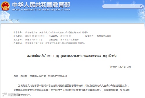 近年来,儿童青少年近视率居高不下,并呈现近视低龄化、重度化趋势。为此,教育部等八部门于2018年8月联合印发《综合防控儿童青少年近视实施方案》。随后,各省市相继发布实施方案,落实儿童青少年近视防控工作。