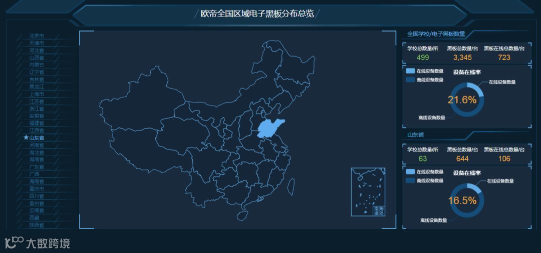 从整体来看,欧帝校园集中控制系统可以通过真实地图查看学校的分布情况,查看全国或某个区域内学校和黑板总数,以及在线离线数,同时还可以掌握学校数量和黑板数量变化趋势图、常用软件使用前10名、学校活跃排名、最近一个月的黑板在线数量。