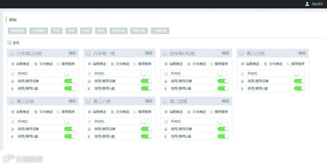 以此为背景和前提下,针对欧帝科技智慧教室互动黑板的管理,欧帝推出了集智能监控、远程管理、信息发布、文件发布、应用统计和资源管理于一体的欧帝校园集中控制系统,用智能的管理方式和直观的统计结果,帮助教育部门和学校更好的指导和管理工作。