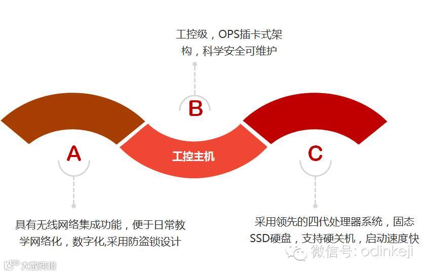 2、在不改变学校现有的教学环境的基础上,能够将学校的普通投影环境、电子白板教学环境、一体机教学环境、交互式投影仪教学环境等升级为新型移动讲台的教学环境配备智慧教室互动黑板硬件架构。
