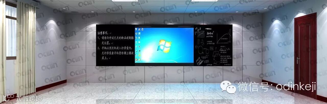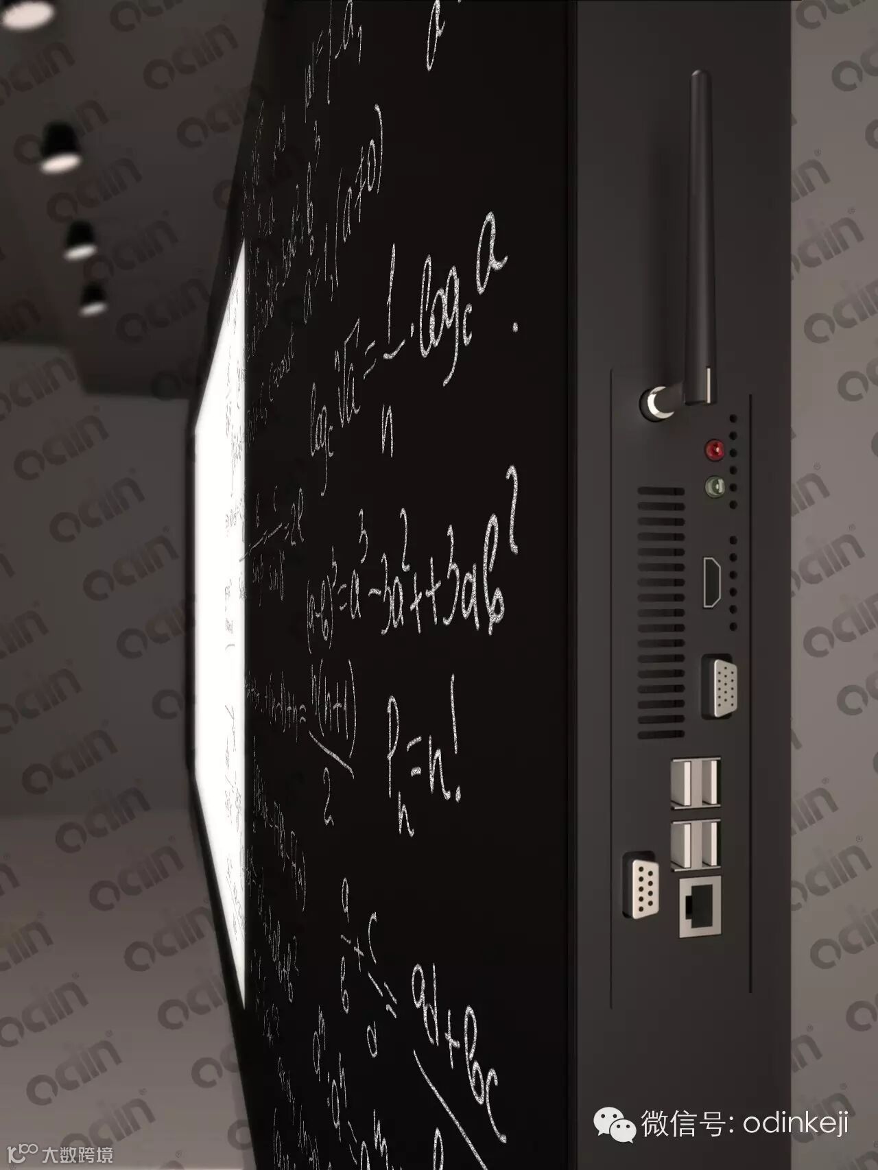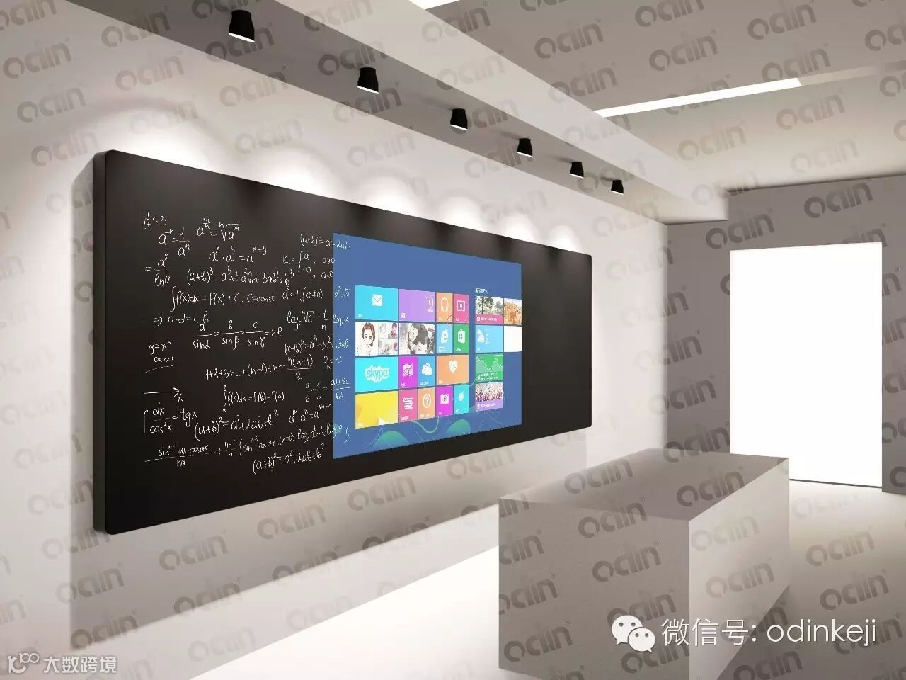 正面显示为一个由三块拼接而成的平面普通黑板,可以在上面用各种水笔书写,又可以根据需要采用粉笔书写。智能一键多媒体功能,当打开电源时,中间一块显示出液晶的显示画面,可以进行触摸互动,而关掉时,显示画面隐形,又显示为一个普通黑板的表象,在上面进行书写。