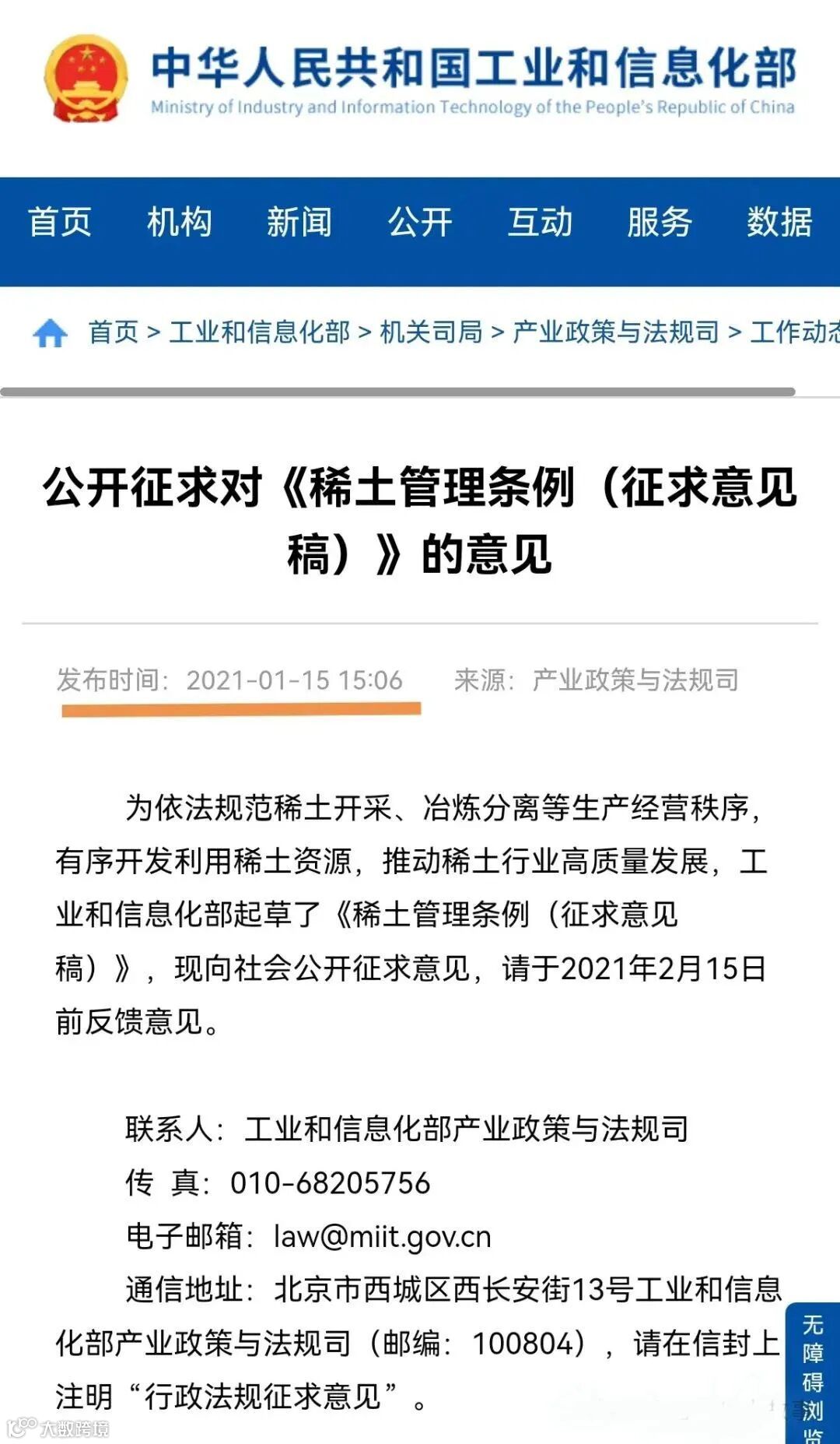 2021年1月15日,工信部政法司在官网发布《公开征求对<稀土管理条例(征求意见稿)>的意见》,征求意见的期限是一个月。