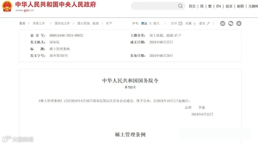 6月29日下午,国务院网站公告,李强总理已于上周签署第785号国务院令,《稀土管理条例》自2024年10月1日起施行。出台《稀土管理条例》是稀土行业的一件大事,工信部和司法部负责人就条例答记者问,中国有色金属工业协会葛红林会长和中国稀土集团敖宏董事长都在第一时间发文解读。