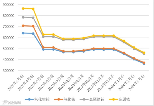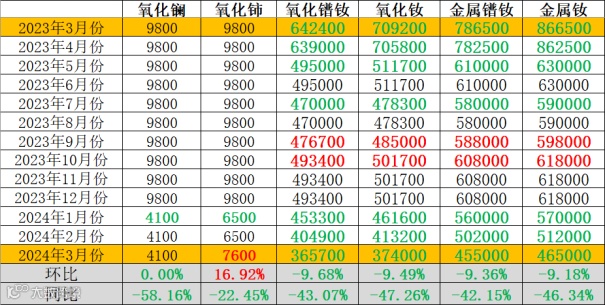 与2023年3月同期相比,氧化镧、氧化铈同比下降,降幅分别为58.16%、22.45%;镨钕系金属及其氧化物价格同比下降,氧化镨钕、氧化钕、金属镨钕、金属钕同比降幅分别为43.07%、47.26%、42.15%、46.34%。