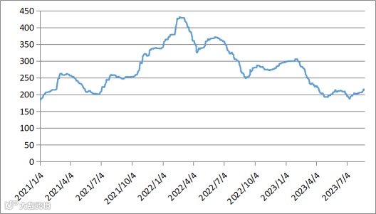 本周有5个交易日,稀土价格指数分别为212.2、215.7、215.0、213.5、213.5,价格指数先升高后降低。20220825-20230825区间稀土价格指数走势图、2020-2023年价格指数同比走势图、2021-2023年稀土价格指数走势图如下: