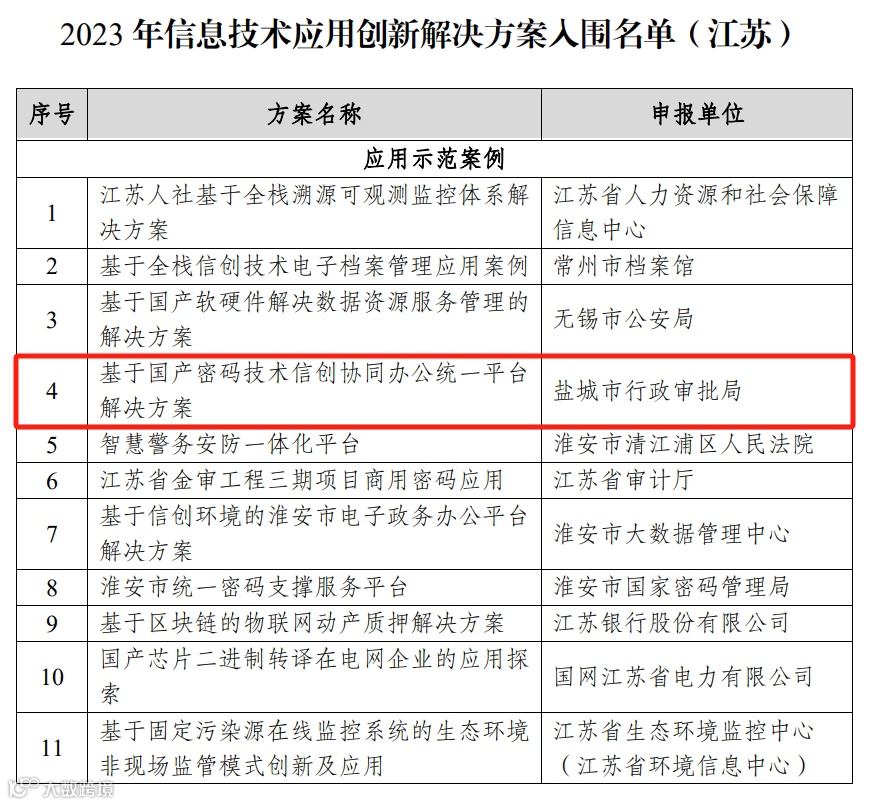 日前,工业和信息化部网络安全产业发展中心(信息中心)通报了2023年信息技术应用创新解决方案征集遴选结果,本次评选从业务支撑能力、技术先进性、应用示范性、产业带动性、实施服务能力五大维度出发。由致远政务助力打造的盐城市行政审批局“基于国产密码技术信创协同办公统一平台解决方案”成功入围,这是对致远政务长期以来深耕信创产业、坚持自主创新的充分肯定。