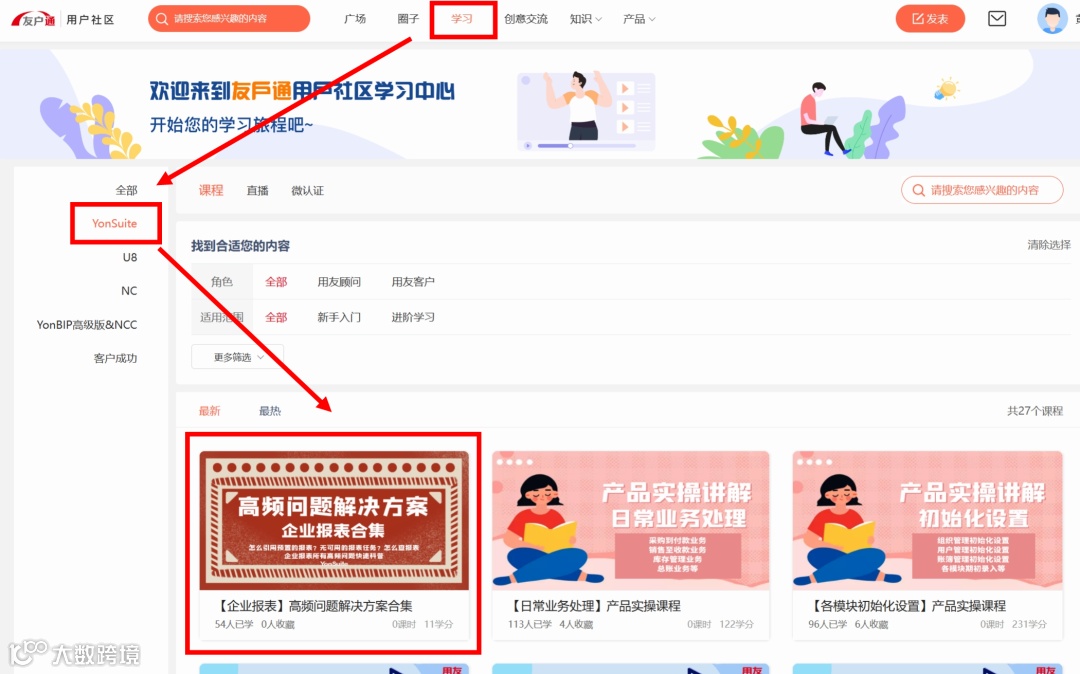 进入社区(点此进入社区),选择顶部【学习】→ 选择知识树图中【YonSuite】→ 选择您想学习的课程,有很多合集可以查看哦。