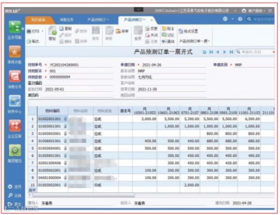 • N+6 滚动预测基于产品预测单、计划订单及库存计算物料供需平衡,形成采购计划、委外计划、生产计划。