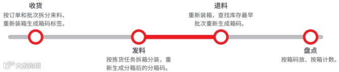 通过应用上线包装(过渡包装),将多样化的供应商货品包装统一为3种标准尺寸的中转箱,设定箱规,打印箱码,重新装箱。