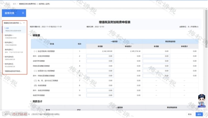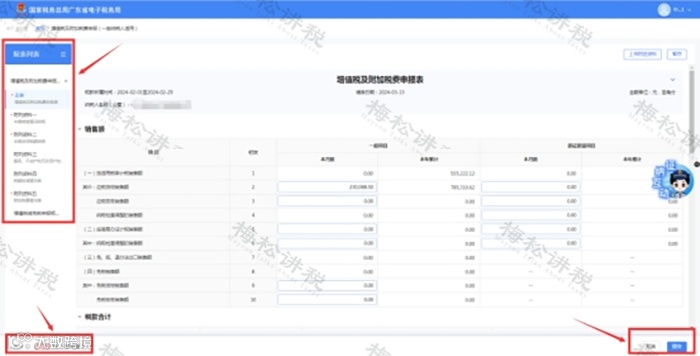 (5)进入填表模式后,按照一般纳税人申报表填表规则,先对相关附表进行填写,附表填写完成后回到主表核实相关栏次数据是否正确,特别是本期需要缴纳的税费数据将显示在页面的左下角。