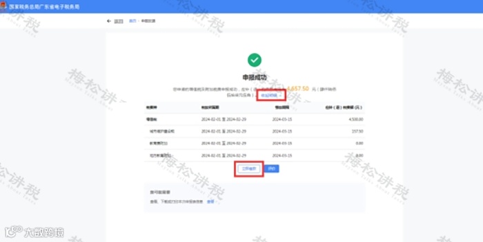 (7)申报成功后,可以点击“展开明细”查看申报明细数据,也可以立即缴款,完成本次申报涉及的税费款缴纳。