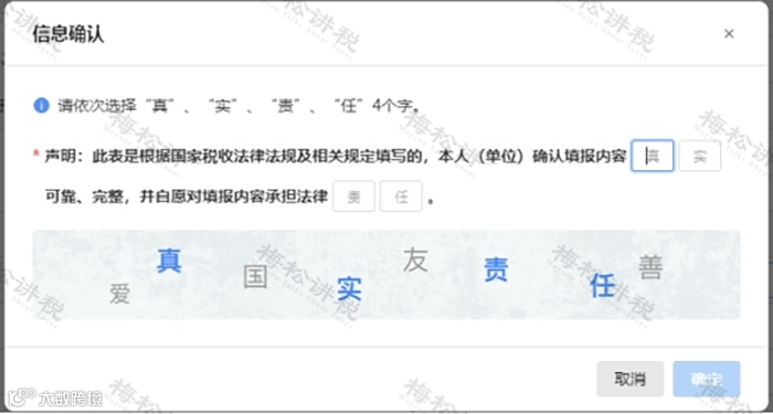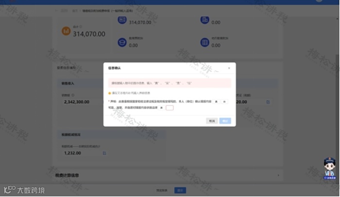 (5)纳税人填写完成,确认数据无误后,点击“提交”,需要纳税人对本次申报结果进行确认声明,纳税人按提示补全声明信息后,点击【确认】即可提交申报。