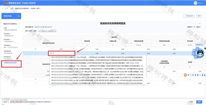 (2)纳税人先填写相应的附表之后再检查主表内容是否正确。若需填写减免信息,则在“增值税减免税申报明细表”附表中选择减免性质代码及名称,并输入对应的减免税额信息(性质代码输入框支持模糊查询)。