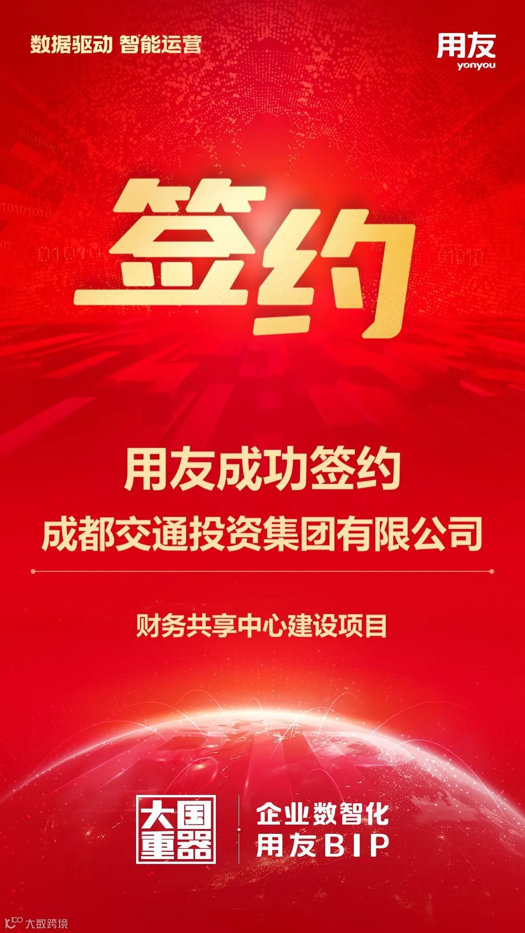 近日,用友成功签约成都交通投资集团有限公司(简称“成都交投集团”)财务共享中心建设项目。双方将基于用友BIP,支撑成都交投集团实现财务共享、费控、全面预算、核算与报告、税务管理、电子会计档案等财务领域应用一体化延展;以财务共享中心建设为突破口,推动财务管理理念变革、组织变革、机制变革、手段变革,提升财务管理水平,有力支撑集团战略目标。