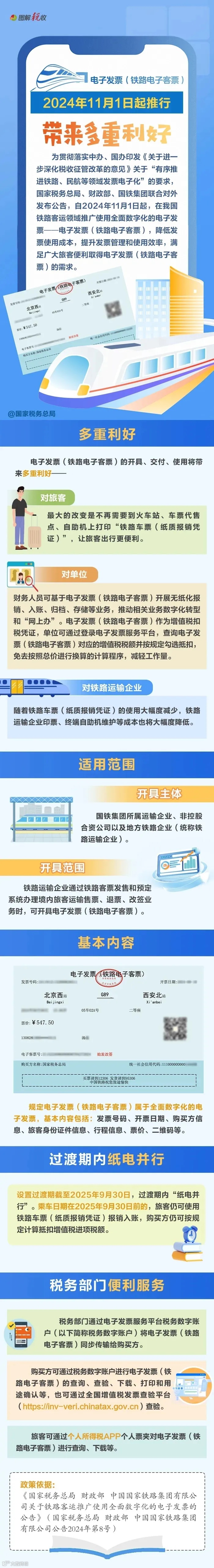 近日,国家税务总局、财政部、国铁集团联合发布公告,自2024年11月1日起,我国铁路客运领域将推广使用全面数字化的电子发票,为旅客和单位报销铁路客票提供便利。