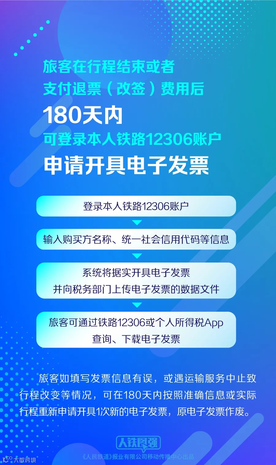 旅客在行程结束或者支付退票(改签)费用后180天内(下称180天),可登录本人铁路12306账户申请开具电子发票,在输入购买方名称、统一社会信用代码等信息后,系统将据实开具电子发票,并向税务部门上传电子发票的数据文件。旅客可通过铁路12306或个人所得税APP查询、下载电子发票。