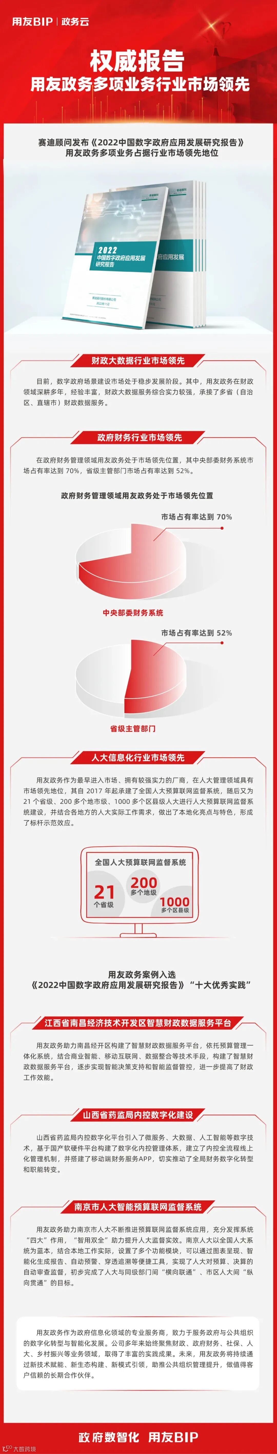 报告显示,用友政务在财政大数据、政府财务、人大信息化领域,占据行业市场领先地位。用友政务优秀案例如江西省南昌经济技术开发区智慧财政数据服务平台、山西省药监局内控数字化建设、南京市人大智能预算联网监督系统应用入选《2022中国数字政府应用发展研究报告》“十大优秀实践”。
