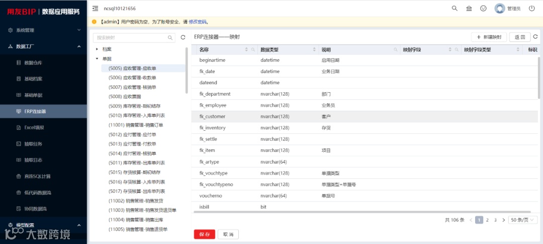 数据应用服务预置ERP连接器,实现与U8 cloud的基础档案及单据的抽取及与标准数仓的字段映射。