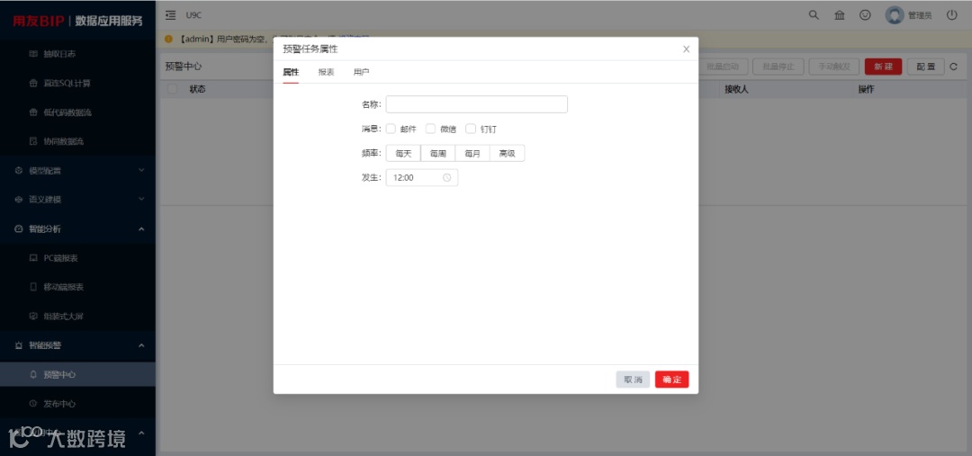 数据应用服务敏捷BI的设计理念,支持基础数据(档案、单据)属性扩展、EXCEL数据填报、支持将报表定时、自动发布到邮件、微信、钉钉等工作平台,解放用户双手、触发关键预警指标后,可以将报表发送给指定接收人……为客户提供强大的数据平台展现能力!