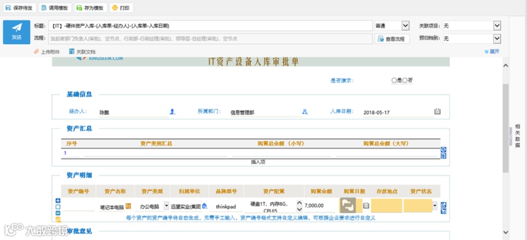 自动触发采购流程,资产采购入库时需要关联采购申请,关联后资产信息自动带入到入库单中;本次入库的资产类别以及金额自动汇总;资产的存放地点和资产状态手工填写,选择或者自动给出初始值。