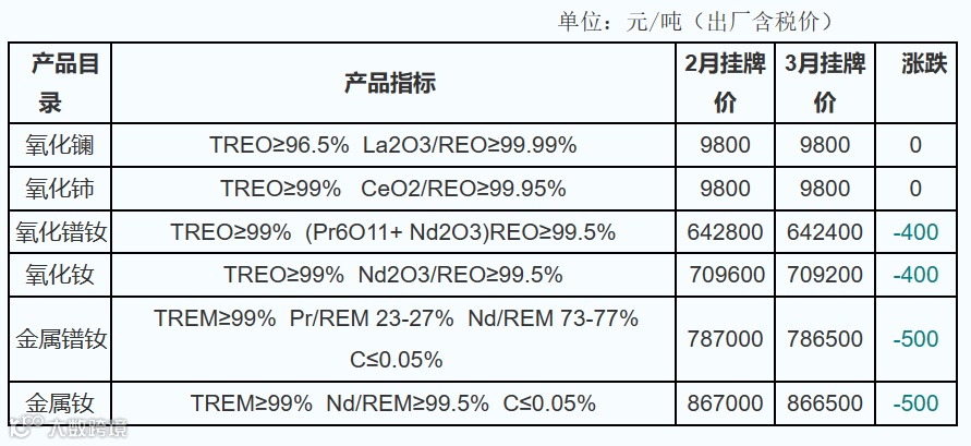 北方稀土高科技股份有限公司发布2023年3月稀土产品挂牌价格