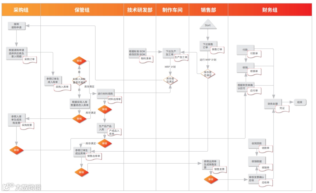 由销售部下达销售订单,通过MRP运算判断库存是否满足,如库存满足则直接进入销售流程进行发货出库及结算,在库存不满足的情况下进行生产下达订单,此时再次运行MRP运算,判断材料库存是否满足,如不满足进入采购业务流程,进行到货入库及结算,如材料库存满足则进入生产、成本流程,进行材料出库、完工入库及成本的精细化核算。实现了财务、销售、采购、库存、生产、成本等流程的集成应用。