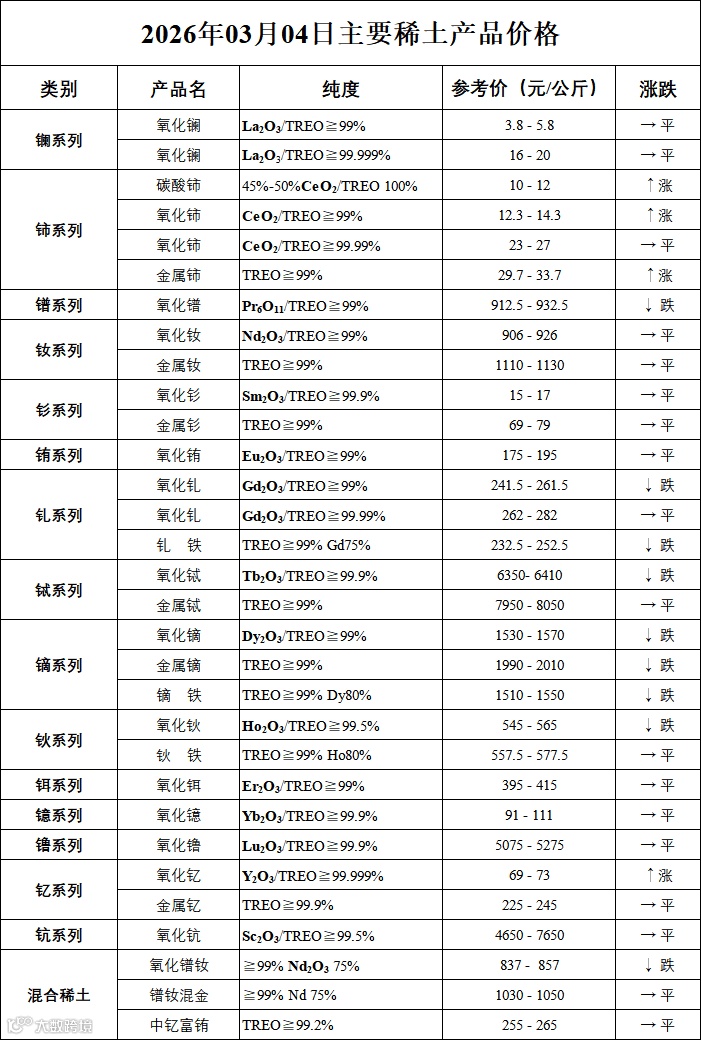 国内稀土市场整体行情偏弱,主要体现在多数产品价格继续回调与实际交易量偏少。轻稀土市场上,受前期利好因素逐渐消耗与下游询盘不及预期的影响,消费市场慢慢由卖方市场转向买方市场,镨钕价格理性下调,但是当前镨钕现货供应仍偏紧。