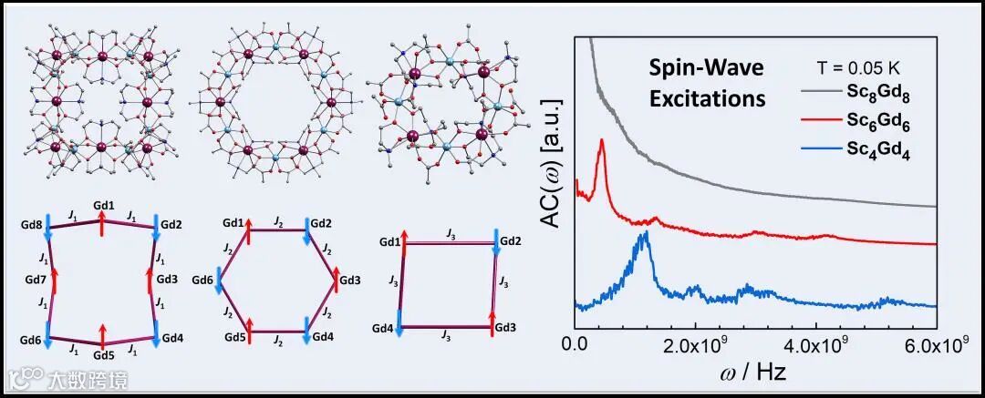 基于前期环状稀土磁性分子的研究,西安交大前沿院郑彦臻教授课题组构筑了系列分子磁环{ScnGdn}(n= 4,6,8)。通过保持分子磁环的结构基元与配位模式不变,改变其拓扑结构,使分子内金属—金属间距离规律改变,进而调节金属离子之间的磁交换作用与偶极—偶极相互作用强度,达到控制自旋波激发的目的。该系列分子磁环中可产生的明显自旋波激发是分子内反铁磁交换作用和偶极—偶极相互作用相结合的结果,该全新模型为分子基自旋波材料和具有可调节特性自旋波器件的开发提供了新视角。